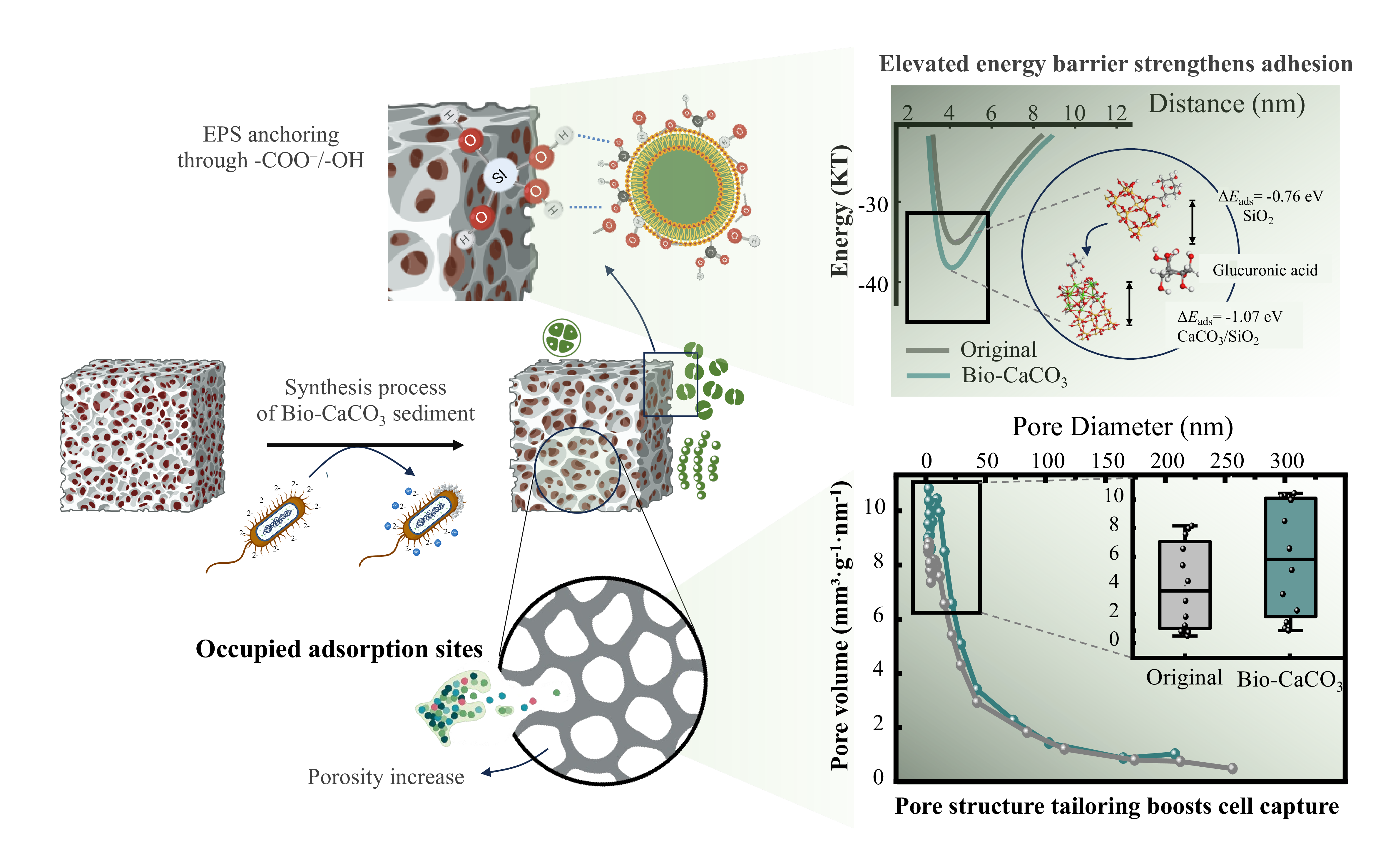 In-situ turbidity enhancement can suppress algal growth in reservoirs but often exacerbates chemical oxygen demand (COD) accumulation due to incomplete organic removal. This study presents a biologically synthesized bio-CaCO3-modified sediment, engineered via Bacillus-induced carbonate precipitation, to simultaneously control algae and reduce COD. The material forms 15–30 nm core–shell clusters with enriched –OH/–COOH groups and mesopores (~19.76 nm), confirmed by SEM, XRD, FTIR, and BET (+1.02 m2 g-1). Adsorption tests against Microcystis aeruginosa, Chlorella, and Limnothrix showed Langmuir-type monolayer binding (R2 > 0.97) and pseudo-second-order kinetics. XDLVO theory and DFT analysis revealed strong EPS–Bio-CaCO3 interactions (\(\Delta E_\text{AB}\) = 31.28 mJ m-2; \(\Delta E_\text{ads}\) = –1.07 ev). Optimal conditions (7.5 wt% CaCO3, 56% residual Ca2+, 85 min) achieved 93.8% Chl-a removal, 88.6% COD reduction, and 87.5% turbidity control (R2 = 0.98), with minimal Ca2+ leaching. By integrating chemisorption, interfacial adhesion, and pore confinement, this material provides a stable, eco-friendly strategy for dual pollutant control and in-situ sediment remediation.